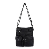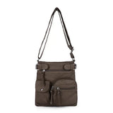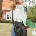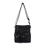 This uniquely designed handbag is one of a kind, featuring a washed look and an adjustable belt strap for the perfect fit based on your body size. The outside has three zippers and an accessory pocket. The inside of the bag is wide open and has an inner zipper, an accessory pocket, and a zipper on the back.